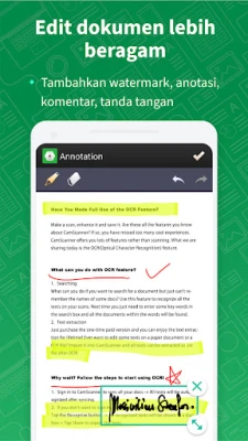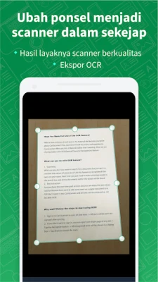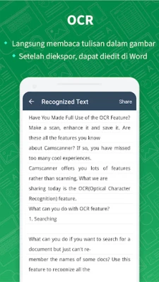 Dengan CamScanner, segala jenis dokumen fisik—mulai dari kuitansi, catatan penting, faktur bisnis, hingga diskusi papan tulis dan kartu nama—dapat diubah menjadi format digital berkualitas tinggi menggunakan kamera ponsel Anda. Teknologi pemotongan cerdas dan peningkatan otomatis memastikan hasil pindaian tampil jernih, tajam, dan profesional, dengan kualitas warna serta resolusi optimal. Tak hanya itu, fitur Pengenalan Karakter Optik (OCR) terdepan memungkinkan Anda mengekstraksi teks dari gambar atau PDF, mempermudah pencarian, penyuntingan, dan pembagian informasi.