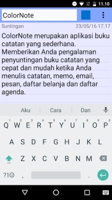 ColorNote adalah buku catatan digital simpel untuk pengalaman mencatat yang cepat dan mudah. Rekam ide, memo, email, pesan, daftar belanja, dan agenda harian Anda secara praktis. Membuat pencatatan lebih efisien dari aplikasi sejenis, ColorNote menjaga Anda tetap terorganisir setiap saat.