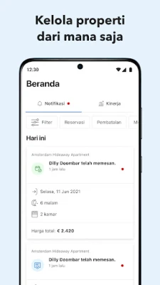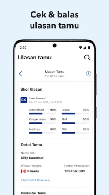 Dapatkan wawasan mendalam dengan tampilan performa harian yang selalu terbarui, membantu Anda memahami tren dan membuat keputusan strategis. Selaraskan jadwal Anda dengan kalender pemesanan interaktif yang menampilkan aktivitas yang telah berlalu maupun yang akan datang, memberikan kontrol penuh atas ketersediaan properti. Telusuri setiap detail reservasi, mulai dari jumlah tamu dan jenis kamar, durasi menginap, hingga rincian harga total dan per malam, termasuk kebijakan pembatalan yang berlaku. Dengan segala informasi penting di ujung jari Anda, mengelola properti tidak pernah semudah ini.