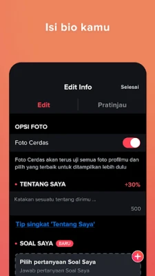 Untuk pengalaman yang lebih optimal, pertimbangkan untuk meningkatkan keanggotaan premium Tinder. Dengan berlangganan Tinder Plus®, kamu akan mendapatkan keleluasaan tak terbatas untuk menyukai siapa saja, mengulang keputusan geseranmu yang terakhir, dan bahkan menjelajahi profil dari lokasi mana pun di dunia menggunakan Paspor. Buka potensi penuh koneksi dengan Tinder Gold™, yang memberimu akses untuk melihat semua orang yang sudah menyukaimu—menghemat waktu berharga—serta memperoleh kesempatan meningkatkan visibilitas profilmu dengan Boost bulanan. Bagi mereka yang menginginkan fitur paling eksklusif, Tinder Platinum™ menawarkan prioritas pada suka kamu, kemampuan untuk mengirim pesan sebelum cocok, dan keuntungan premium lainnya untuk memastikan kamu mendapatkan perhatian yang pantas. Pilih paket yang paling sesuai dengan kebutuhanmu dan mulailah perjalanan menemukan koneksi yang lebih bermakna dan memuaskan.