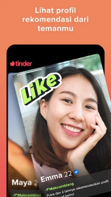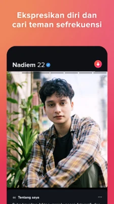 Jelajahi dunia koneksi autentik di Tinder, sebuah platform dinamis di mana kamu bisa menjadi dirimu sendiri, tak peduli orientasi atau preferensimu. Kami berkomitmen membantumu menemukan individu yang tepat, apa pun jenis hubungan yang kamu cari, dari pertemanan santai hingga pencarian belahan jiwa. Ungkapkan minatmu, kenali calon pasangan secara mendalam, dan biarkan percikan asmara mulai tumbuh. Dengan profil terverifikasi foto, kamu akan merasa lebih aman dan percaya diri, memastikan kejutan yang menyenangkan hanya datang dari buket bunga. Ingin menguji kecocokan secara virtual? Fitur tatap muka daring kami siap membantumu. Baik saat kamu bepergian ke luar negeri atau sekadar ingin memperluas lingkaran sosial di lingkunganmu, Tinder menghubungkanmu dengan komunitas global, siap untuk petualangan kencan atau pertemanan baru di mana pun kamu berada.